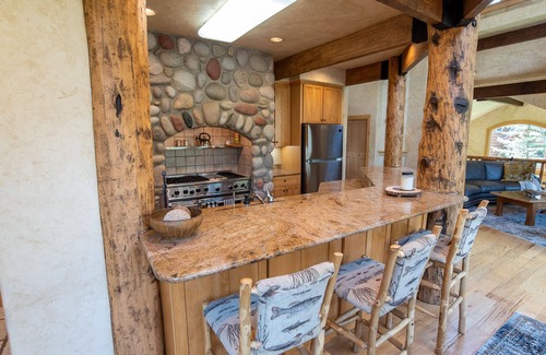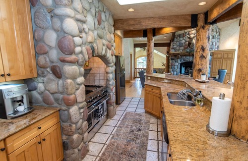 The living area is bright, open and spacious, with vaulted ceilings and huge windows overlooking the river. There’s a spectacular floor-to-ceiling river-rock gas fireplace and a flat-screen TV for relaxing and enjoying a movie or the game. Plus, there’s a huge family room area downstairs with another gas fireplace, a wet bar and a pool table. Both living areas feature high-end leather furniture and plenty of seating options!