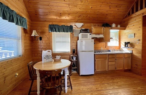 This quaint, pet friendly cabin will sleep four guests comfortably. Main level bedroom offers queen bed. Loft accessed by ladder offers queen platform bed. The greatroom offers gas log fireplace, Smart TV, efficiency kitchen and dining table.