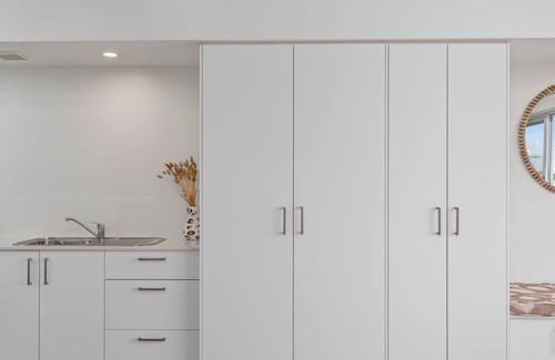 Inside, the studio boasts a thoughtfully designed layout that maximises comfort and functionality. The inviting queen bed is complemented by neutral white decor and furnishings, creating a serene retreat that mirrors the tranquil coastal setting. The fully equipped kitchen features a fridge, freezer, electric oven, two-burner hob and a air fryer for making meal preparation a breeze. Enjoy your morning coffee with the Nespresso machine while seated at the bench, where you can gaze out at the ocean. The spacious bathroom includes a large shower, and the convenience of a washing machine ensures you’ll have everything you need for a relaxing stay.