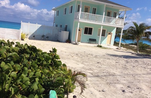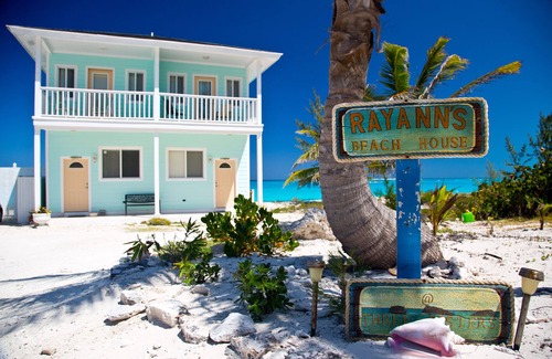 Rayann's Beach House @ Three Sisters' Rocks, located five minutes drive from Exumas international airport and 15 minutes drive from George Town, the main town of Great Exuma Island, is a 2-story town house that has two x 2 bedrooms, 2 and a half bathroom apartments. One unit is called 'Ray' and the other unit is named 'Ann'. Both Ray and Ann upper level houses 2 bedrooms and 2 bathrooms. Each bedroom has a balcony. The master bedroom has a panoramic view of the sea. downstairs is the kitchen, a half bathroom, and a dining and lounge area. A double French door opens onto a private veranda with a breathtaking view of the ocean. There are ceiling fans in every room and central air conditioning.