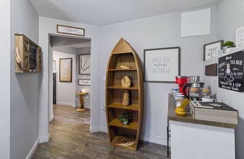 The newly re modelled kitchen is super cute and has ample space and amenities to allow you to comfortably make your favorite meal with a beautiful view of the pond. My kitchen has all the amenities of home from spices to pots, pans, and dishes so rest assured you can cook to your hearts content.