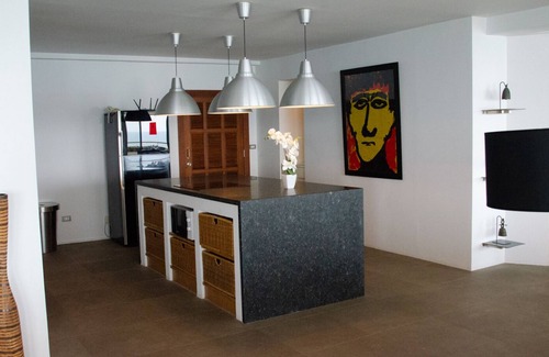The condo is an open floor type and beholds a kitchen with marble stone topping and a separate big cooking island, a V – shaped spacious living room with on the left and right hand side an air-conditioned bedroom and private bathroom (master- & guest-room).