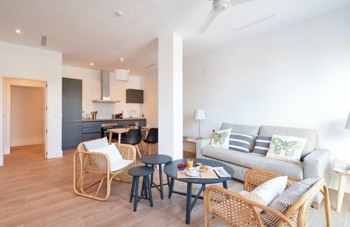 The open plan kitchen is well equipped with all the appliances and utensils expected of a quality rental property (stove, fridge/freezer, oven, washing machine, coffee machine, etc), perfect for those guests that enjoy cooking and entertaining. The living room is furnished with 1 sofa and several armchairs facing a Smart TV. A dining area with seating for 4 is also provided. The property's private terrace offers an alfresco dining area.