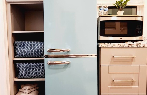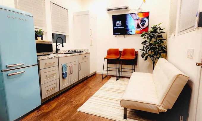 Experience the charm of a serene and peaceful tiny home/RV community nestled away from the street, yet minutes from downtown. Hosted by Cecy and her husband, this adorable tiny home boasts thoughtful design details and clever craftsmanship. With a high ceiling, step-in shower, and large TV with superb sound, it offers a well-appointed and comfortable stay.
