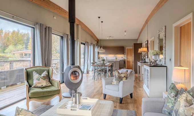 This lakeside cabin in Yorkshire at Brompton Lakes has a contemporary and sophisticated design, making it perfect for year-round getaways and special occasions.