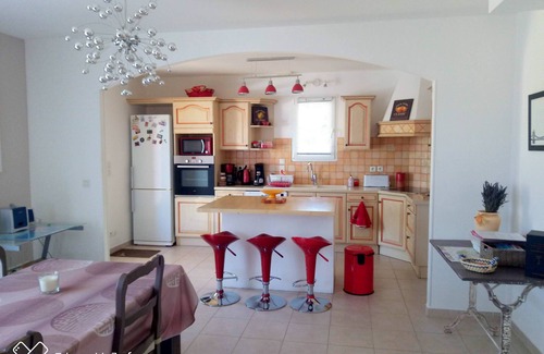 -A large main room of about 50m2 air conditioned including a kitchen (refrigerator, dishwasher, oven, microwave, induction cooker, coffee maker, kettle and the necessary dishes and utensils), a dining area eat bordered by a bay window and seating area (large screen TV).