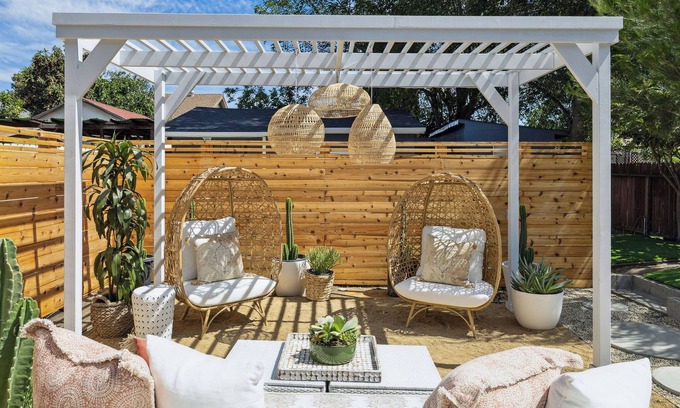 This adorable designer bungalow is conveniently located near public transportation and within walking distance of various amenities in The Laurel Neighborhood of Oakland. You'll find restaurants, supermarkets, coffee shops, groceries, pharmacies, and bars all within reach. The home is a popular choice for traveling nurses, individuals relocating to the Bay Area, grandparents visiting family, and families remodeling their homes. Guests can enjoy a recently renovated and beautifully furnished home with a Boho Chic vibe, private lush gardens, and a lighted patio with a pergola. It offers a peaceful garden oasis in the desirable Laurel Neighborhood of Oakland. With its convenient location below Highway 13 and above Highway 580 and within walking distance of Macarthur Blvd in The Laurel District, Casa Laurel provides easy access to many shops, eateries, bars, and grocery/convenience options.