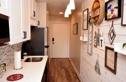 This is a larger 500+ SF unit contrasted with the smaller units in the other building. This unit includes a separate bedroom instead of a studio bedroom space. Roku television and internet is provided.