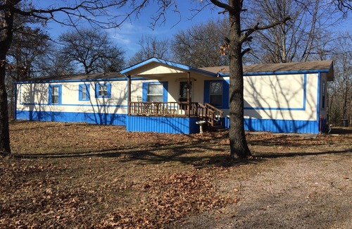Close to OKC or Dallas, Lake Texoma is the perfect quick get away from the city for a weekend. Tall trees surround the home on 3 acres. Enjoy the fire pit and a grill (bring your own fire wood and charcoal). There is WIFI and recent updates like all new flooring, granite counter tops, new windows, doors & paint. The property easily sleeps 8. There is a king in the guest bedroom. A queen in the master bedroom and a twin daybed with twin trundle. There is a queen sleeper sofa in the living room. There is also 2 queen air mattresses for extra guests. The kitchen has a refrigerator, stove, microwave, dishwasher, and plenty of basics. (Pots, pans, coffee pot, toaster, griddle, etc.) The home is 10 minutes from Catfish Bay Marina and equally close to Alberta Creek Marina and the sandy beaches of Lake Texoma on the Oklahoma side. Lake Texoma is known for its Striper fishing and there are many fishing guide services available. There is space to park your boat or trailer during your stay. There are lots of Casino’s to choose from and a beautiful 18-hole golf course that is ranked in the top 3 of courses in Oklahoma.