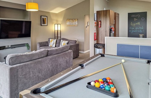 The spacious and modern living/dining/kitchen area is fully equipped and also includes coffee machine, microwave, dishwasher, and air fryer. Enjoy movie nights in front of the 55-inch Smart TV, whilst others play on the combined pool table/table tennis/diner.