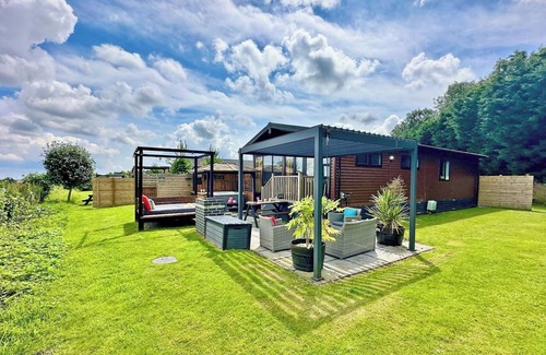 Recently upgraded with Gazebo over hot tub and side bar with stools. Sat on a corner plot with amazing views over open fields, this luxurious and contemporary open plan two-bedroom lodge is the perfect place to relax and unwind. Master bedroom with Smart TV, en suite shower room and walk-in wardrobe. Twin bedroom. Family bathroom with bath and shower overhead.
