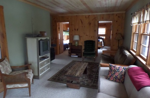 There are two cabins on this property and they may not be rented separately. The main cabin is a 2 bedroom, 3/4 bath with large open livingroom with hearth fire place. The main cabin has a full kitchen with everything you need to cook and serve meals and table seating for 6. There is also a large screened in porch with glass table seating for 6 overlooking the beach, lake and views to the nearby island.