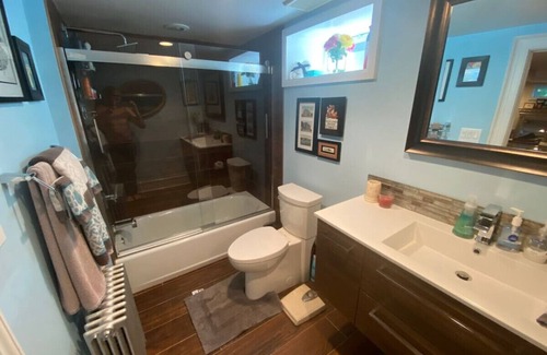 This deluxe lower level apt is avail for select longer stays and Ideal for singles or couples as a home away from home! Designed as separate and private from the rest of the home, this apartment with it's own entrance has every amenities incl TV area, internet, kitchen, coffee bar, spa bath and more! In warmer weather enjoy big backyard patio & grill. A 10 minute walk to downtown Red Bank restaurants, arts & theater district. ABSOLUTELY NO SMOKERS! There is a flight of steps to the apartment.