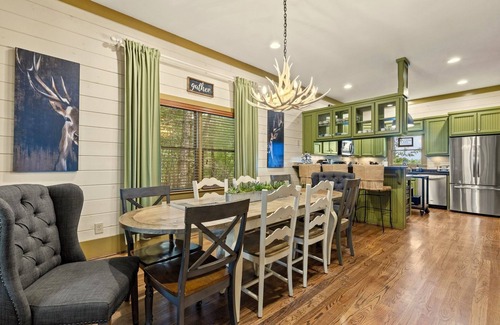 • Southern Hospitality Lodge – 5 King Suites + Bunk Room (6 Queens), heated pool, 12-ft hot tub, game room, fire pit. Sleeps 22. VRBO ID 1021458