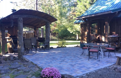 This is a custom-built, two bedroom, one bath home located in the rural Cascade Mountains of Southern Oregon. It is nestled on a wooded acre near the town of Prospect. (population 500). The home is sided with rough-sawn cedar and the interior walls are done with cedar and pine. The Great Room is highlighted by a lodgepole pine spiral staircase. The visitor is welcomed by a comfortable front porch with Adirondack chairs for seating and there is a large patio area and fire pit behind the cabin for outdoor entertaining. However, this is not a party cabin and guests are limited to the number of persons agreed upon in the reservation.