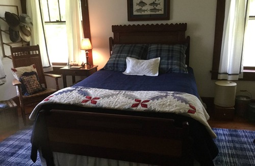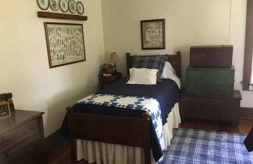 GUEST ROOM - Edwin's Bedroom is 16 ft by 16 ft, featuring a queen size, antique Eastlake bed with luxury mattress, additional antique twin size bed, ceiling fan, and large antique desk. This room can accommodate three guests - for an additional $40 per night charge for the third guest. This is a second floor bedroom with 3 beautiful windows showcasing the lay of the farm land surrounding the lawn.