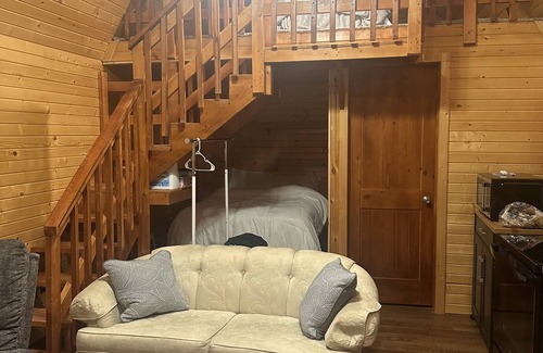 Enjoy a quiet stay in the country at our modern cabin, this cabin has 1 bedroom with a double bed, and 2 lofts that are only 5 feet high, so you'll have to stay low while using that area. One loft has a double size air mattress and the other loft has a twin air mattress. We offer a full kitchen, full bath, A/C, heat, WiFi (we are out in the country so sometimes our wifi doesn't always work). Our amish bulk food store is located on the property for a unique shopping experience. EV chargers are also available on the property. We are located just minutes from UCM and Whiteman AF Base (home of the B2 Stealth Bomber), and Kansas City is only an hour away. The Rock Island Trail is 7 miles away and we can provide shuttle if needed. We have EV chargers available. We do have security cameras in the driveway and parking lot that is monitoring 24 hours a day.