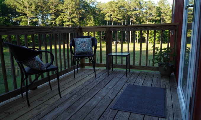 Your apartment has two bedrooms, bath, full kitchen and living area. Enjoy morning coffee or afternoon wine sitting on your balcony. Go downstairs and try a little swinging. Rope lights provide a glow in the evening. Look out over the pasture and check the four-legged critters (goats and donkeys).