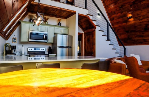 Perched on a lush hillside, 'Ravens Summit' is a newly constructed, two-story, loft-style cabin that sleeps 4, nestled in Campton in Red River Gorge. The cabin exudes warmth and authenticity with the open concept living area with large windows that flood the space with natural light. There's everything you need for an amazing Red River Gorge getaway and is decorated to make you feel right at home. Includes a fully equipped kitchen (standard coffee maker, Kuerig and microwave), electric stove, dishwasher, full size refrigerator, free WiFi, private hot tub, flat-screen TV, electric fireplace, charcoal grill (bring your own charcoal), outdoor fire pit, and Washer/Dryer.