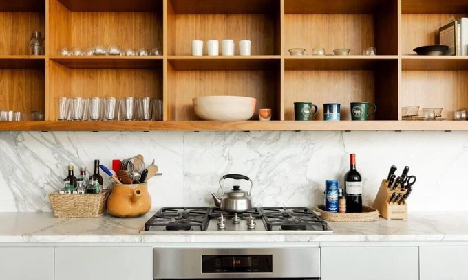 The kitchen is a standout, featuring top-of-the-line appliances, a spacious island with marble countertops, wooden cabinetry, equipped with a Viking refrigerator, Miele stove and oven, Bosch dishwasher, microwave, toaster, blender, and a coffee machine. The adjacent dining area, with seating for eight opens onto the expansive wooden deck with alternative al fresco dining, fresh mountain breezes and breathtaking mountain views.