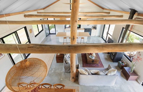 Large open plan kitchen, living area with high raking ceilings and exposed timber post and beams that were originally milled from the property. The two bedrooms, bathroom and separate toilet lead off the main room.
