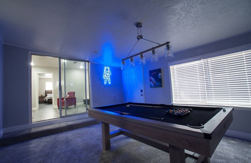 Very modern and stylish home, this house is very unique and offers alot, including a pool table, quiet neighborhood, and two very lavish bathrooms. It can easy accompany a large amount of guest with five queen sized beds. There is two cameras on the front and back of home for the safety of our guests.