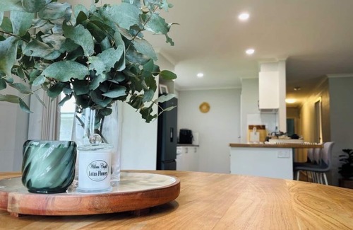 The house features a modern open-plan design that invites natural light, creating a warm and welcoming atmosphere. Thoughtfully appointed rooms include spacious bedrooms with built-in robes, a master suite with a walk-in robe and ensuite, and covered outdoor areas offering tranquil rural views. Securely fenced on a sprawling 1-acre block, guests can enjoy privacy amidst expansive vistas.