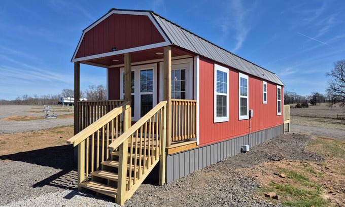 Welcome to Redbud Roost, a one-of-a-kind Tiny Home with a cozy country feel. The unique barn shape and loft inside will transport you to a simpler, more peaceful lifestyle. Located in the beautiful countryside of Northeast Oklahoma, you'll be surrounded by nature and tranquility. Take a stroll to our large pond and try your hand at fishing, or take in the beauty of our mile-long hiking trail. And don't forget to bring your furry friend along – we have a brand new 5,000 square foot pet park for them to play and explore. Looking for a little friendly competition? Head over to our new pickleball court for some outdoor fun. We can't wait to welcome you as our guest at Redbud Roost, where you'll feel right at home in the great outdoors.
