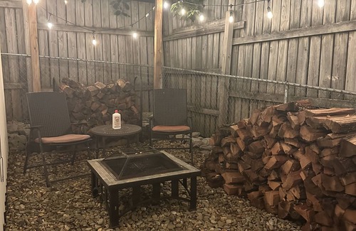 Steps away from the patio is a relaxing area with a firepit with two chairs.