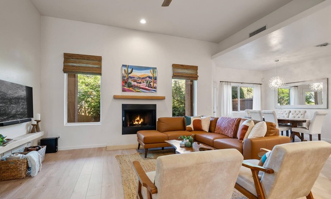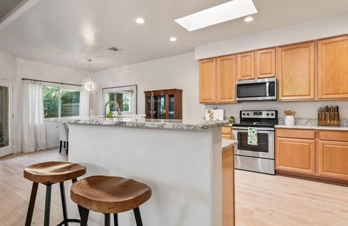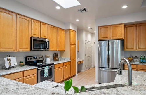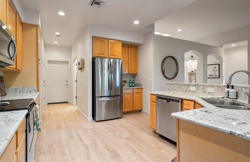 Discounted for our first season! Be one of the first Guests to enjoy this newly renovated home with new furnishings and bedding. Designed to make you feel at home and safe in this private gated community in Oro Valley, ranked as the afest city in Arizona. Rest easy in this modern well equipped Rancho Vistoso patio home end unit with yard. Primary King Suite features private en-suite bathroom with 2 separate vanities, walk-in shower & spacious walk-in closet. Two additional bedrooms are adjoined by a full en-suite bathroom, complete with double vanity and tub. All bedrooms boast plush bedding for a peaceful night's sleep & bathrooms are stocked with toiletries. Relax by the fireplace in the spacious great room, find solace in the den, create your favorite dish in the fully equipped new kitchen, or relax in your private backyard. Take a dip in the carefree heated community pool & spa with stunning views of the majestic Catalina Mountains. No detail was overlooked when carefully appointing this home, aiming to exceed guest's expectations. Embrace your love of nature and history at the Honey Bee Village Archeological Preserve, Historic Steam Pump Ranch and Catalina State Park, all only a stone's throw away. It's easy to stay active with numerous golf courses, tennis & pickle-ball courts, biking & hiking trails and more, all within minutes from your doorstep! Rest assured of a stress-free stay knowing that your hosts/owners are nearby and licensed contractors ready to solve any issue on a moment’s notice. 30 day minimum stay.