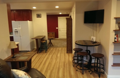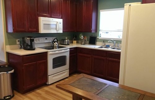 Kitchen is fully stocked with all utensils and cooking items needed. features a stove, microwave, full size fridge, blender, crock-pot and Keurig coffee pot!