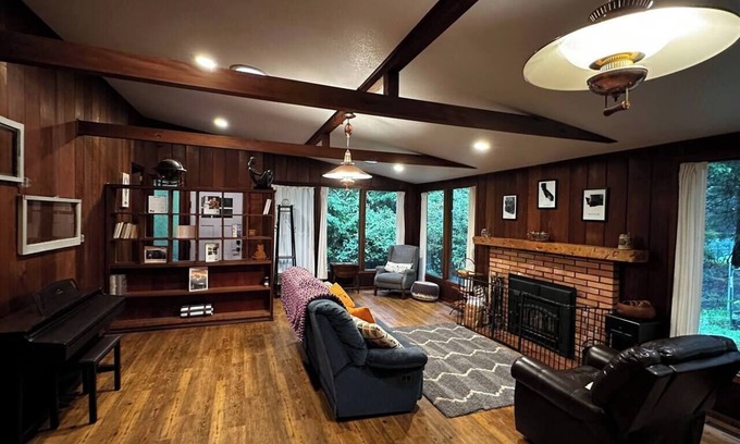 The front living room boasts panoramic windows overlooking the forest. The back living room has a large couch and TV with access to streaming services.