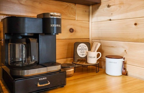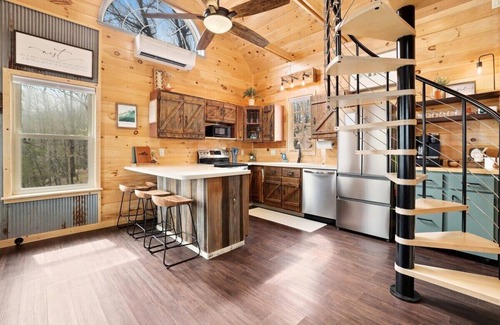 When entering through the front door, the first thing you'll notice is our stunning log cabin walls, corrugated ceilings and cabin-like decor. Straight ahead, you'll see our fully stocked kitchen with rustic wooden cabinetry, plenty of storage, and an island with barstool seating. To the right, you'll see our living space with an overstuffed sectional, a 44-inch Hisense Roku TV and plenty of natural light. Between these two spaces, you'll find an electric fireplace, perfect for heating the home.