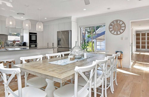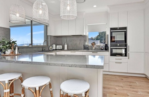 Reflections at Sunset Beach, Soldiers Point is a newly renovated, 5-bedroom waterfront house with expansive water views of the bay and Soldiers Point Marina.