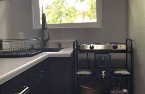 Guests will arrive at a main front house (where host resides), then walk though a covered car port on the left, enter through a coded gate to a spacious back yard. There you will find the new raised addition for your exclusive use. Guests may access raised deck (at the top of the stairs), tan-bark yard area directly connected to raised deck, and fire pit (by appointment).
