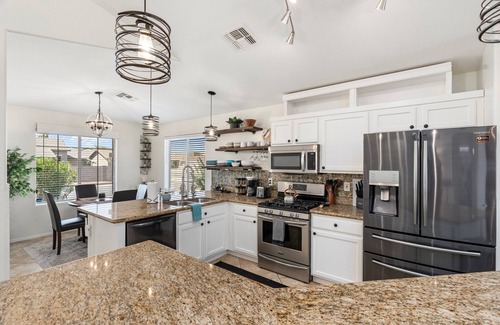 Indulge in the ultimate warm-weather retreat at this exquisite home. Offering picturesque golf course views and a contemporary interior, this 3-bedroom, 2-bath residence sets the perfect stage for your Arizona getaway. When you're not savoring a grill session on the patio or enjoying a refreshing dip in the private refreshing pool, catch an exciting Baseball Game @ Chase Field or embark on a day trip to Old Town Scottsdale for a delightful shopping experience. As night falls, treat yourself to some entertainment at the nearby San Tan Mountain Casino or gather around the patio for an enchanting al fresco dinner. Finish the day by the cozy fire, exchanging stories and relishing some s'mores under the captivating desert stars!
