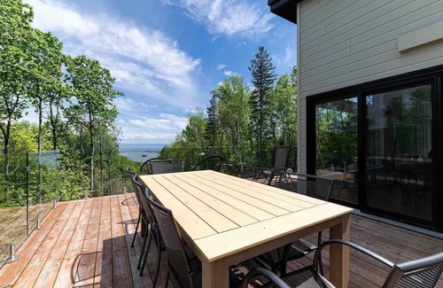 Relax in your perfect summer retreat. Unwind on the expansive deck with panoramic views of the St. Lawrence River or enjoy the private spa. The peaceful surroundings and close proximity to Baie-Saint-Paul offer a tranquil haven. Whether you're hiking, sightseeing, or enjoying the modern amenities of this well-equipped home, this space is ideal for families, friends, or a special getaway. Immerse yourself in nature and let your surroundings rejuvenate you!
