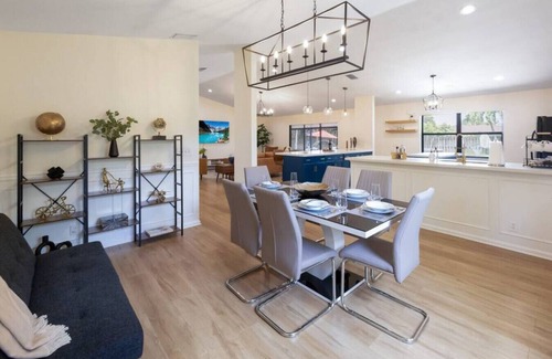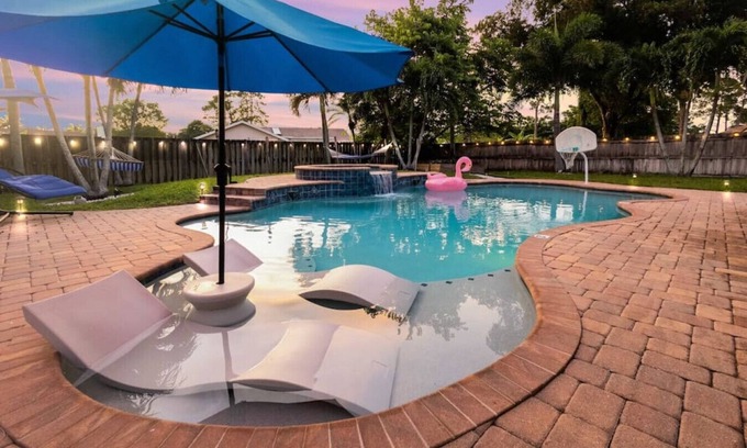 This is a serene, inviting retreat for families and couples alike who want to unwind in paradise, while still being close to Palm Beach attractions. Enjoy a private backyard oasis with LED-lit pool, hot tub, al fresco dining, and luxe lanai space with BBQ grill and outdoor TV. This dreamy vacation spot balances luxe amenities with homey features. Bring your furry friends for a getaway to remember!