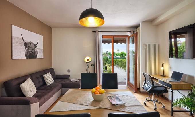 The completely renovated Markus apartment is located on the ground floor of a residence with a swimming pool (swimming cap mandatory - guaranteed opening period from 15/05 to 30/09) and a tennis court located in Pacengo, a village of Lazise, 15 minutes\' walk from the lake and the beach, and 800 metres from the charming town centre. The 4/6 person apartment has a bright double bedroom, a spacious second bedroom with a double bed and a single bed, a bathroom with a window and shower, a washing machine and a hair dryer, a large living room with a sofa bed suitable for an adult, a comfortable desk for working, Wi-Fi, a large satellite TV, a modern kitchen with a fridge, oven, induction hob and dishwasher. The living room opens onto the terrace, furnished with a table and chairs for outdoor dining, and the small private garden. Air conditioning, 2 bicycles and an uncovered parking space are available for guests.Small pets are allowed. Non-smoking apartment.We recommend this modern and comfortable apartment for couples of friends or guests with pets who wish to enjoy the tranquility of this residence, the large swimming pool and the tennis court.The final price consists of:- RENTAL paid directly to the owner- GUEST SERVICES (check-in, check-out, bedding, towels, courtesy line, on-site assistance, professional cleaning, reservation management, commission paid by the host to the portal, correspondence, etc.) offered by Regarda Travel to the tenant.Mandatory tourist tax to be paid in cash upon arrival.Mandatory security deposit to be paid by credit card upon arrival: €300.00.Regarda Travel is a property management agency located in Lazise, on Lake Garda, with years of experience in the tourism and hospitality sector. We manage with satisfaction more than 80 houses, villas and apartments for our guests. We know and live in the area, so we can proudly recommend the best experiences to live in this renowned area of northern Italy.We can also recommend the best guided tours to visit the beauties of Lake Garda, Verona, Milan, Valpolicella, Venice and Mantua, boat trips, bike tours, food and wine itineraries... and much more! We are also at your disposal to book tickets for the opera at the Arena di Verona, car rentals, private transfers, discounted tickets for the main thermal spas and amusement parks such as Gardaland, Caneva or Movieland.