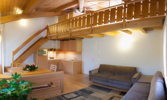 It is divided on two levels: at the first floor, one double bedroom, spacious living room with cooking area and double sofa-bed, bathroom and balcony with view on the lake; at the second floor attic with 3 beds.