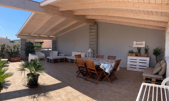 Relais La Terrazza is a villa on the first floor in the center of the small village of Palmadula. From the 100 sqm terrace with veranda and suspended garden, this house enjoys a view of the magical hills of North-Western Sardinia, of a glimpse of the sea and of the village itself. The structure is only 2. 2 km from the first beach (Porto Palmas), at the same time it is within walking distance of services such as market, bar, pizzeria, newsstand, butcher shop etc. The house is equipped with all the comforts for a holiday of relaxation and practicality. This in fact, despite being in the center of the country, enjoys a very high degree of privacy, the terrace on the first floor has a furnished veranda, BBQ, worktop, sink and solarium, suitable for enjoying summer evenings, preparing barbecues open or simply sunbathe. Relais La Terrazza is recently restored, it consists of a large room with a view of the hills, a kitchenette, a living room with sofa and TV, 3 bedrooms and two bathrooms. The master bedroom has an en-suite bathroom, a hydromassage shower with a stereo and a USB input so you never miss listening to your favorite music. The second bathroom is available to the other 2 rooms, which is also equipped with a hydromassage shower. The house has a public parking lot right in front of its entrance, the ground floor courtyard is at guests' disposal to store luggage, sea toys, etc.