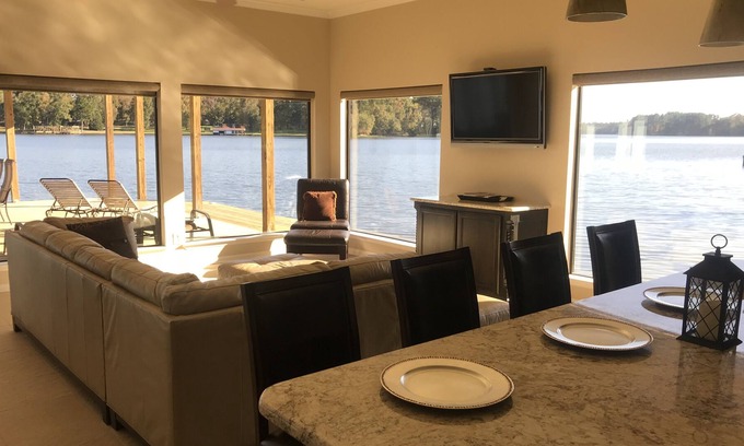 This upscale home is located in a quiet East Texas neighborhood offers 1,281 sq ft of deck space and 786 Sq ft of living space. This peaceful getaway is conveniently located in the Piney Woods just 1-1/2 hours from Downtown Dallas.