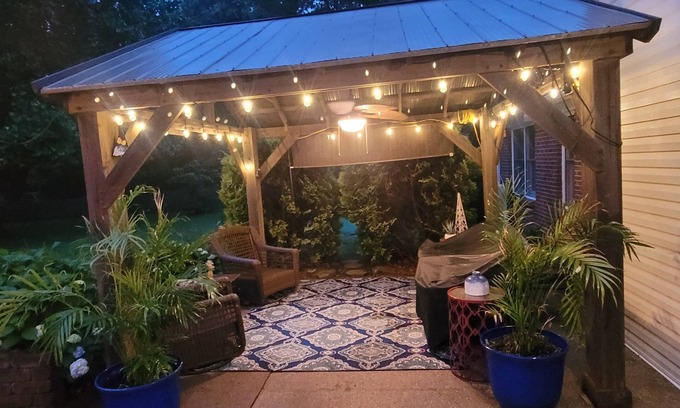 Outdoor Paradise: Enjoy the serenity of the beautiful backyard, featuring a saltwater pool (open May 28 – October 30), a covered pergola with ceiling fans, an outdoor dining table, a cozy couch, and patio chairs. There’s even a putting green and firepit, perfect for making s’mores and winding down on a summer evening. Cook up a delicious meal on the gas grill and relax to the sounds of nature and the evening breeze.