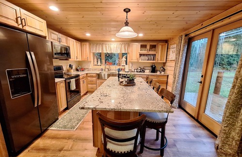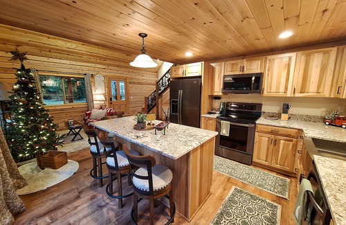 Step outside onto the deck or covered front porch and breathe in the fresh mountain air. Surrounded by towering trees and a peaceful ambiance, our log cabin offers a private sanctuary for nature lovers. Relax in our outdoor barrel sauna nestled in the woods. Take a morning walk or evening stroll on our private trails, complete with wooden bridges, native vegetation and wildlife. Enjoy your morning coffee on the deck or porch while watching the deer pass by and listening to the birds sing, or unwind in the evening with a glass of wine as you stargaze.