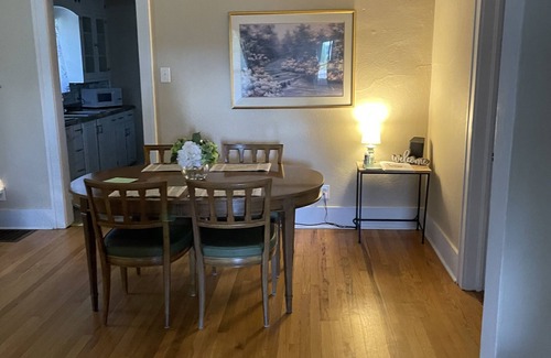 The space is warm and inviting. There are two smart TVs in the home that guests can use to sign into their own streaming accounts. There are two bedrooms with queen beds with dressers, a small bedroom/bedroom/office with a twin bed that has an area to hang your clothing since there isn’t a dresser. There is a full kitchen onsite that includes a fridge, stove/oven, dishwasher, disposal and tea & coffee bar. There is a formal dining area that seats 6 guests. There is a main level laundry room with a new washer and dryer that are provided.