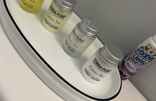 Private bathroom stocked with fluffy towels, washcloths, and luxury amenities—shampoo, conditioner, body wash, and lotion.