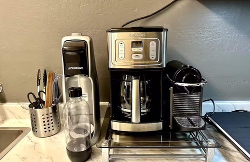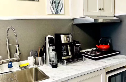 The fully equipped kitchen has everything you need to prepare your favorite meals, along with full access to the washer and dryer for your convenience. For coffee and tea lovers, the kitchen includes a Nespresso machine, a regular drip coffee maker, a French press, and a tea kettle. We also provide Italian coffee and a selection of fine teas to start your mornings just the way you like.