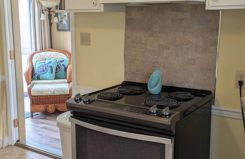 The kitchen has a full-size refrigerator, stove, oven, microwave, toaster, Keurig, and double sink. You’ll find plenty of glassware, plates, bowls, silverware, pots, pans, etc. We make sure our guests have paper towels and napkins, as well as tea bags, coffee pods, cream and sugar. Just off the kitchen is the sunroom with a bar height table for four and chair with ottoman. Sliding glass doors take you to the back deck.
