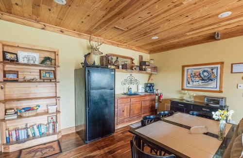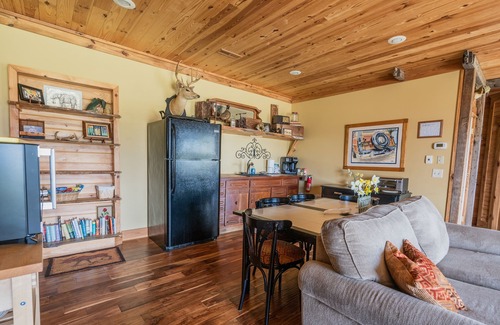 Your accommodations feature two cozy bedrooms and two baths, ideal for couples and families alike. The master bedroom boasts a king-size bed with a comfy couch that converts into a full-size sleeper, while the second bedroom has a queen-size bed, accommodating up to six guests comfortably. Enjoy the convenience of a well-equipped kitchenette, complete with a full-size fridge, microwave (that also functions as a convection oven and air fryer), toaster oven, and more. Dine al fresco on the large covered patio while grilling on the six-burner outdoor grill, or gather around the stone fire pit as deer stroll by. An expansive dining table expands to seat up to eight, ensuring everyone can be included in your wedding festivities.