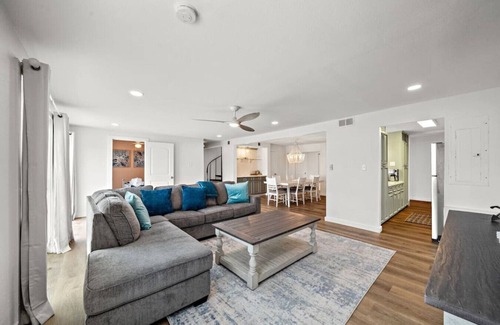 This spacious 6-bedroom Galveston beach house provides the perfect setting for families and friends. Stroll to the nearby beach for some sun and sand. Unwind by the backyard firepit after a day of exploration. Enjoy movie nights in one of the two cozy living areas. Catering is a breeze with two fully-equipped kitchens, perfect for large groups or those with different dietary needs. Finally, soak up the refreshing ocean air on one of the two large patios, each offering a relaxing spot to unwind.